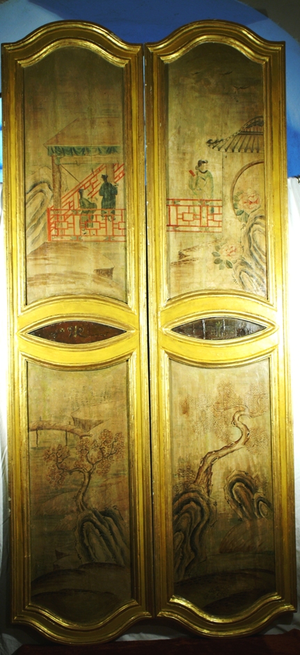 Rarissima coppia di ante lignee laccate. La forma è sagomata e scorniciata, con molure dorate. All'interno, due paesaggi 'a chinoiserie' con alberi e figure in policromia. Sono elementi di una boiserie torinese, di epoca XVIII° secolo.