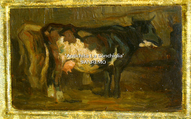piccola tavoletta del pittore Ruggero Panerai. Raffigura dovuta mucche nella stalla. E 'firmato in basso a Sx. Bella cornice dorata incisa. C. 20 x 12 ca ..