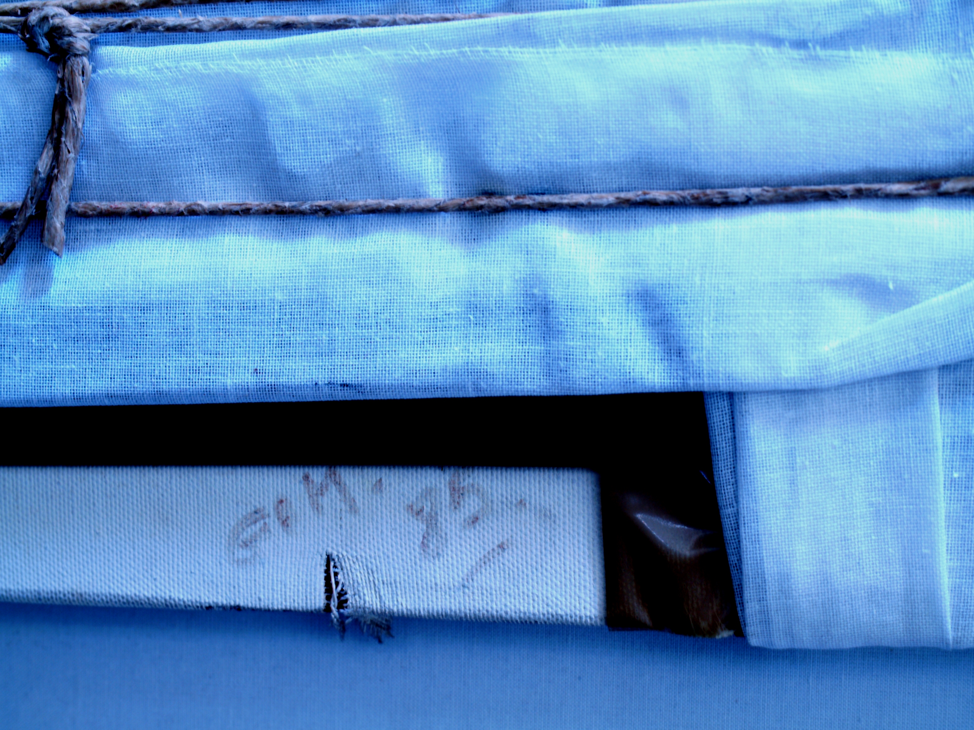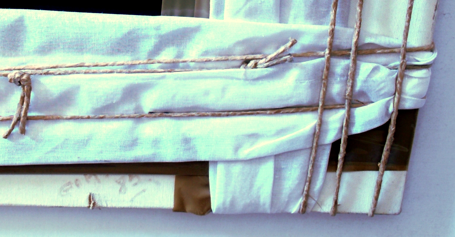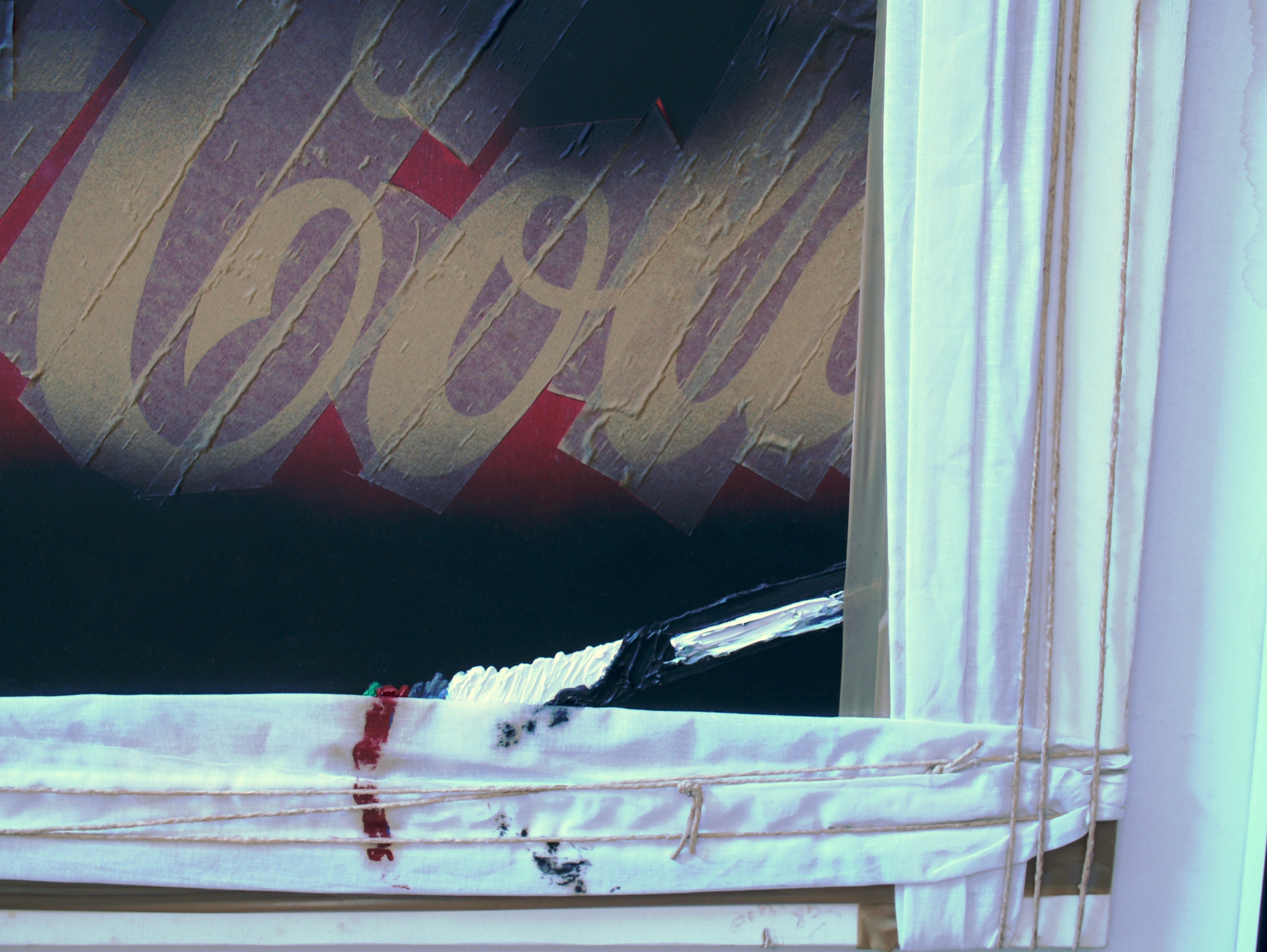 Dipinto moderno 'COCA COLA' realizzato in tecnica mista con collage, olio, corda, scotch, tela da imballo. L'opera è nata incorniciata 'sotto vetro', in una cornice/teca che ne permette una presentazione tridimensionale. Infatti il dipinto sembra 'imballato' con cordame e nastro scotch vario, per dare l'impressione di un pacco pronto per la spedizione. Presenta una scritta 'G.A.M '85'.