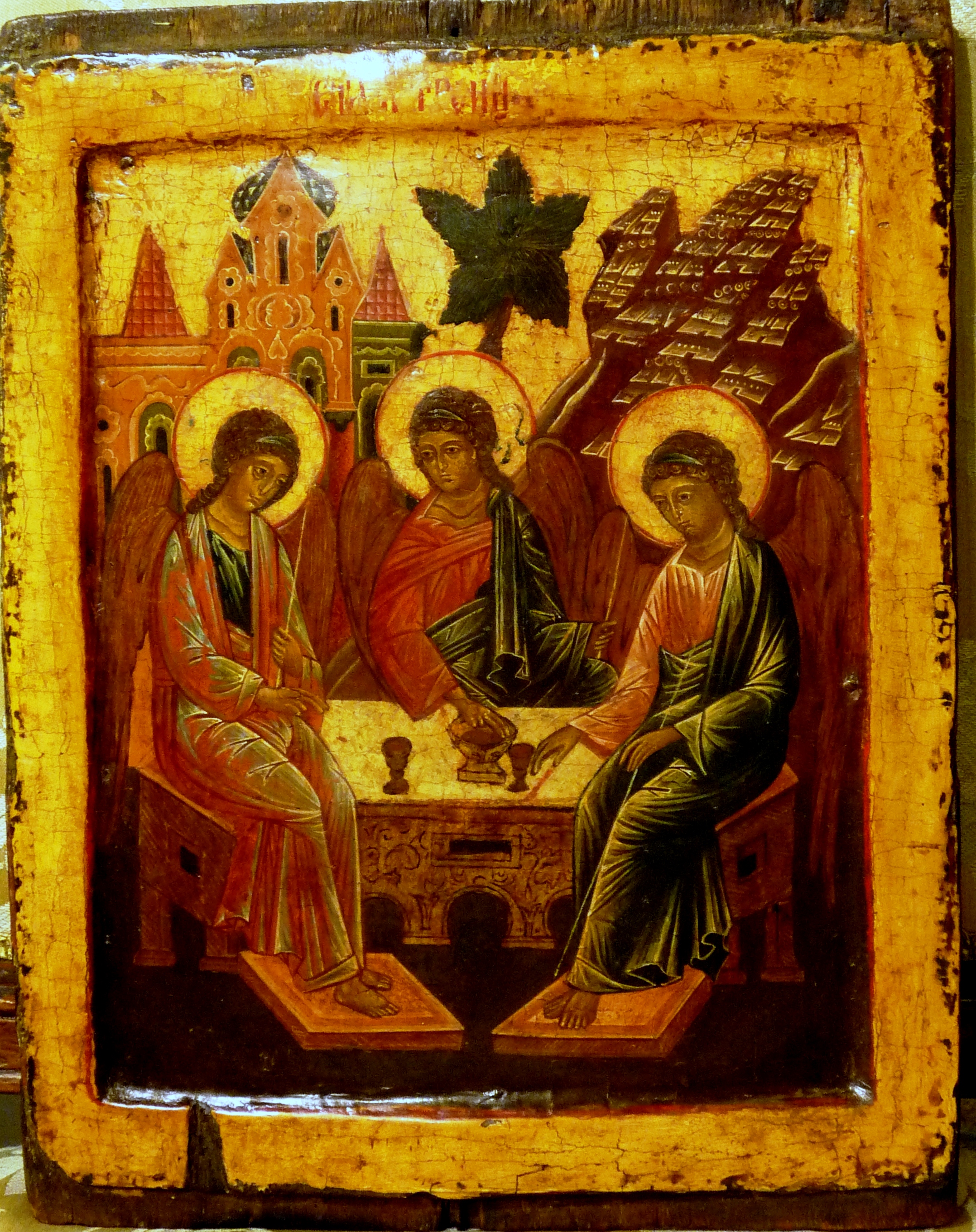 Antica icona russa raffigurante 'la trinità angelica'.