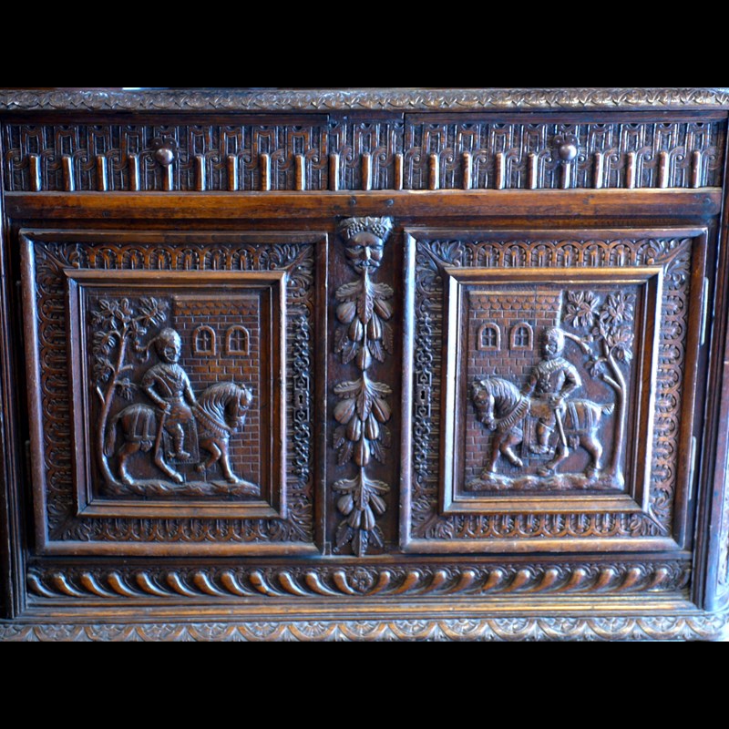 Il fronte è a due ante intagliate con due cavalieri in armatura, con sovrastante coppia di cassetti intagliati. Francia, fine del XVI° secolo.